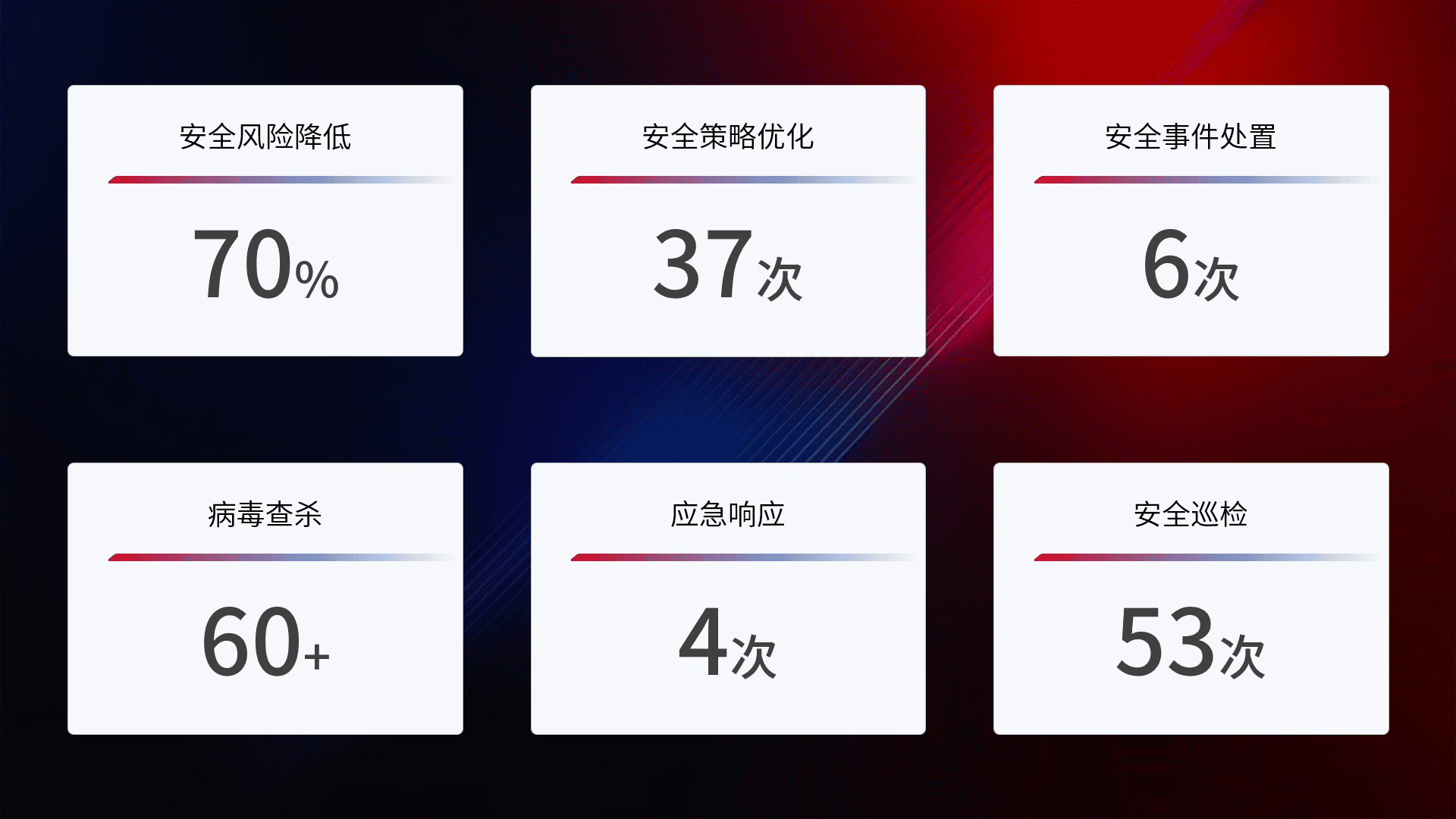 提供全面的安全事件报告体系,,,包括处置报告、、周报、、、季度和年度总结,,,结合持续监控,,,,帮助客户深入了解网络安全状况。。。